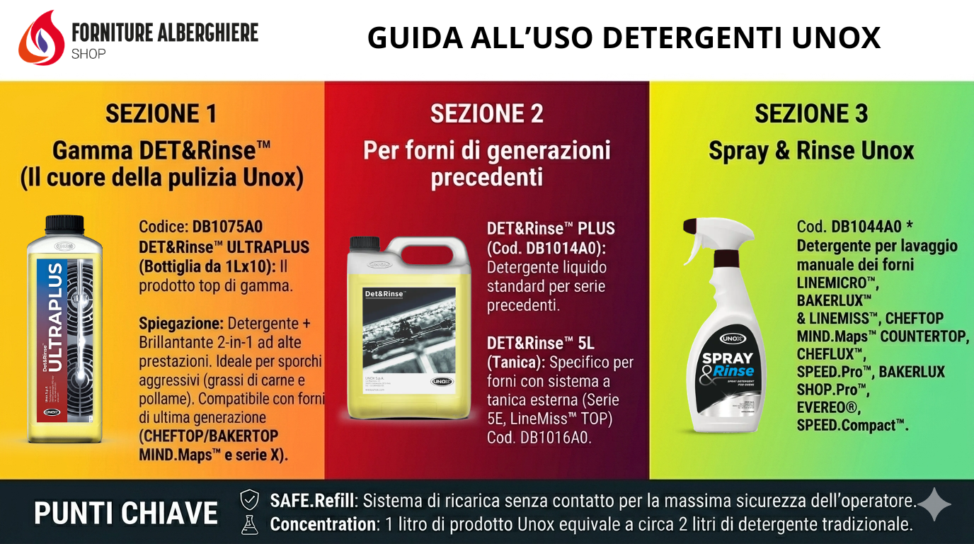Detergenti per forni Unox per la manutenzione e il lavaggio dei forni professionali Unox.