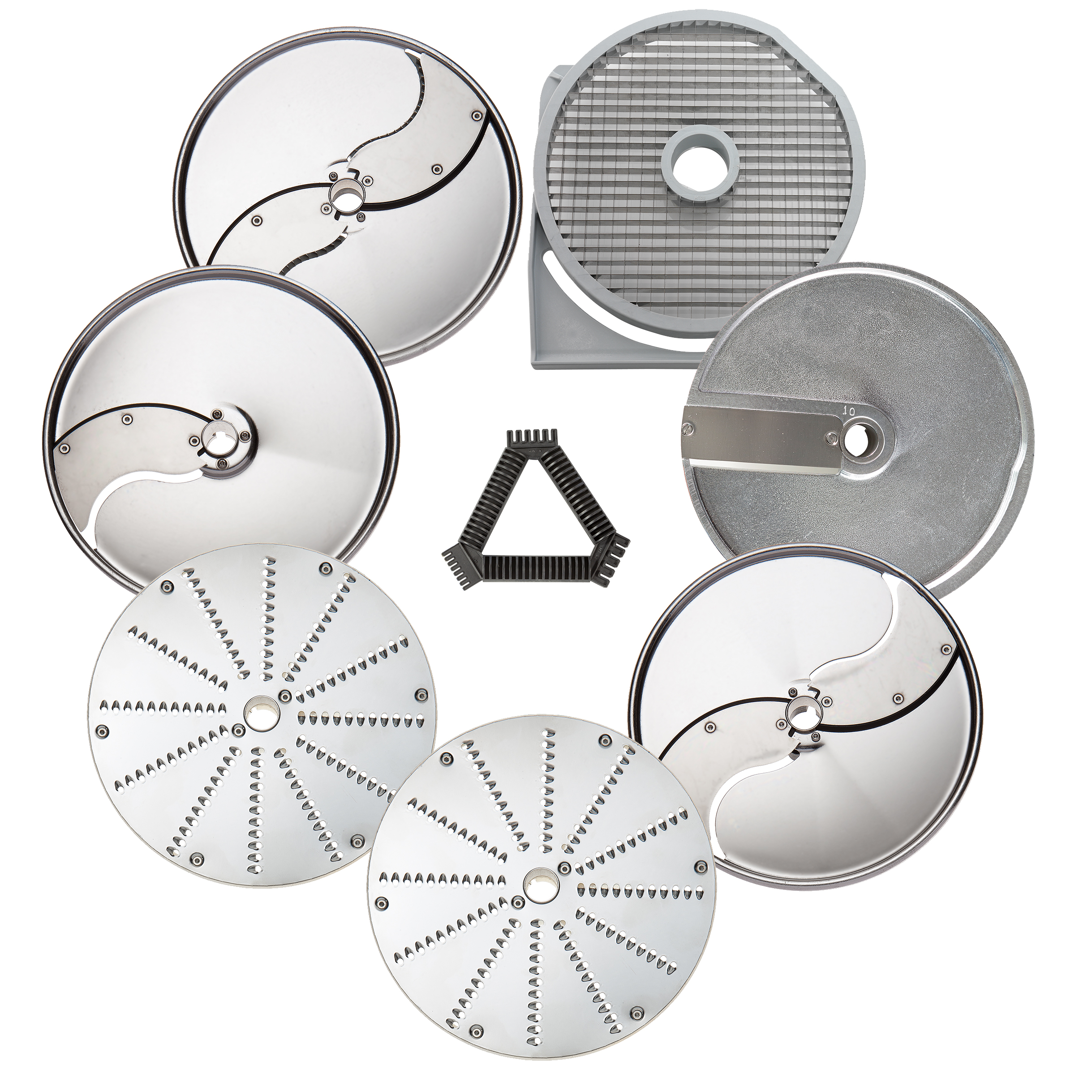 Set di 7 dischi (dischi per affettare da 2 mm, 5 mm e 10 mm, dischi per grattugiare da 2 mm e 7 mm, disco per grattugiare 4×4 mm, griglia per cubetti 10×10 mm) e strumento per la pulizia della griglia